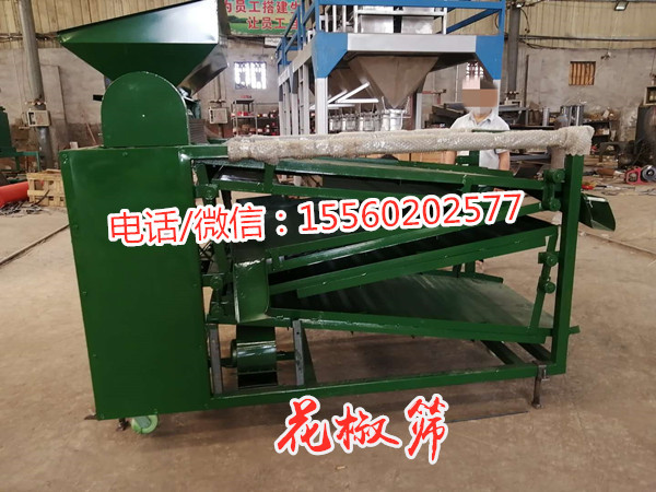 使用該機器可以把花椒中的籽、桿、葉、塵土等雜質分別清選出來,同時分出花椒顆粒等級,取代繁重的人工清選勞動。花椒清選機是專用于花椒脫粒、清選、分級、去雜的機械。 花椒篩選機及其他配套設備(提升機、皮帶機、絞龍、螺旋輸送機等)用途和特點:本機下方設有風機,可將從篩面流下的椒籽和花椒進一步風選分離,使篩凈率大大提高。