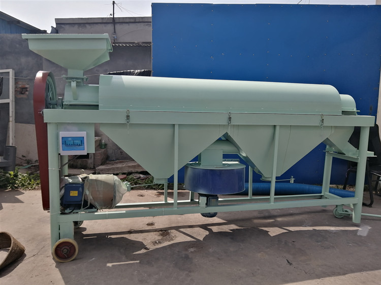 物料投放到進(jìn)料斗后,打開電源,把風(fēng)力調(diào)到適中,機(jī)器篩面做往復(fù)式運(yùn)動(dòng),風(fēng)機(jī)高速運(yùn)轉(zhuǎn),打開下料插板,物料落到篩面上篩選,機(jī)器共有三層篩網(wǎng),一層篩選出來的是大于水稻的雜質(zhì),水稻和小于稻種的雜質(zhì)落二層篩網(wǎng)上,塵土小于水稻雜質(zhì)落到三層篩網(wǎng)上,各自從前端的出料篩出來,粉塵通過抽塵風(fēng)箱抽出來。
